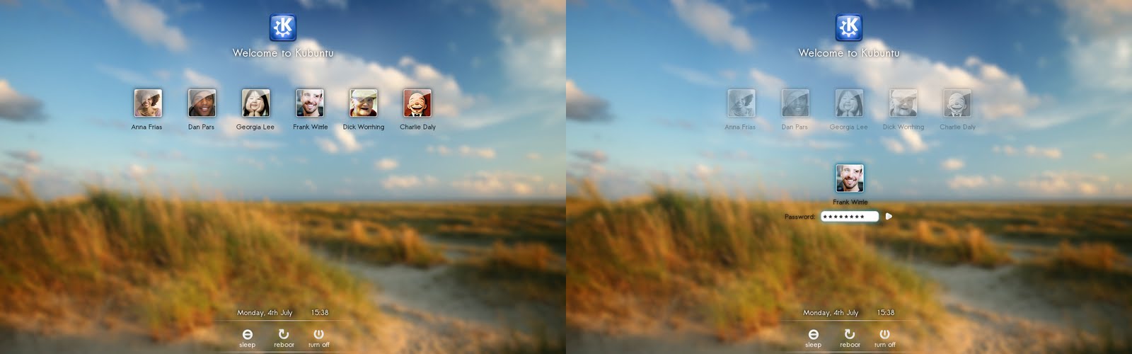 | sheytan | apachelogger: for my ldm there's only one animation. If you click on your user (avatar), the other ones fades a bit, your picture slides from the list down, box for pass appears and session button. It will take no longer then 0.5s couse this will all happen same time | 21:26 |