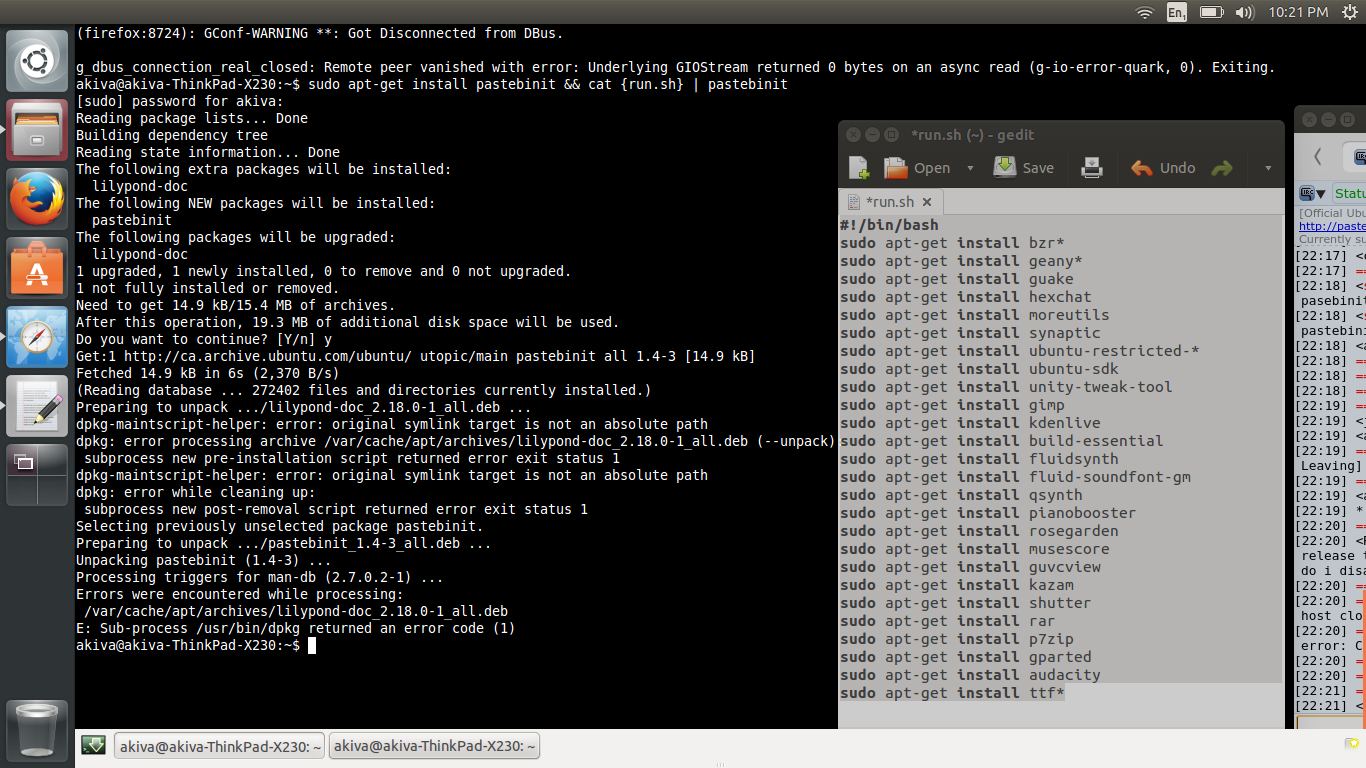 | stan_man_can | daftykins: Partially worked, now I'm seeing this debconf: DbDriver "config": /var/cache/debconf/config.dat is locked by another process: Resource temporarily unavailable | 22:45 |