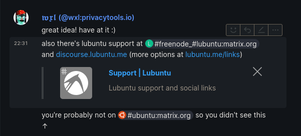 | wxl[m] | you're probably not on #ubuntu:matrix.org so you didn't see this ↑ | 06:32 |